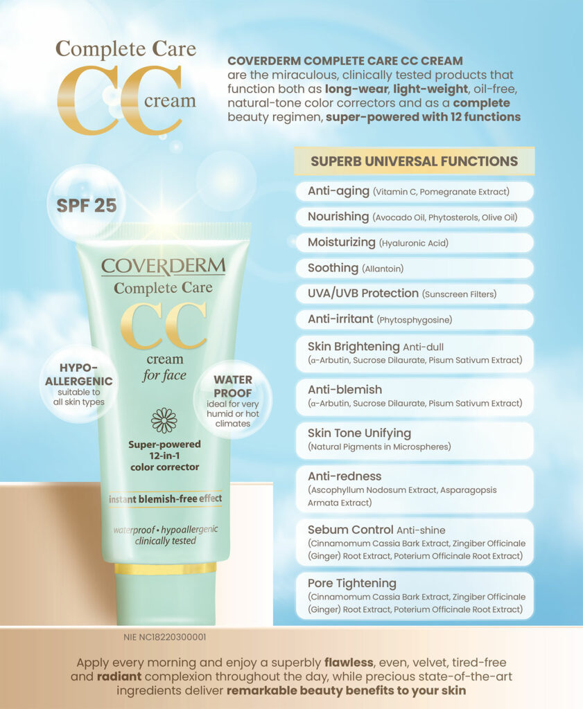 Coverderm Complete Care CC Cream has been clinically tested with the functions of long-wear, light-weight, oil-free, natural tone color correctors and complete beauty regiment, enriched with a complete composition as a super-powered CC Cream with 12 functions.